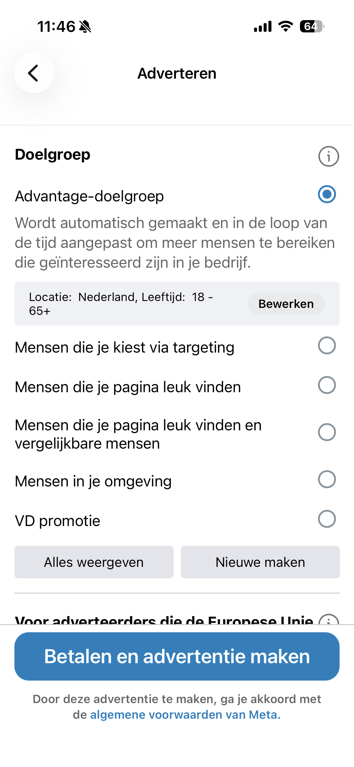 Wanneer je op de knop “Adverteer” klikt krijg je direct een voorbeeldadvertentie, waarschijnlijk met jouw profiel. Je kunt onderaan klikken op “aan de slag” en dat is wat je moet doen om te beginnen met adverteren. Vanaf hier kun je inloggen met je Facebook account, advertenties aanmaken, teksten toevoegen, foto’s toevoegen en kiezen welke doelgroep je wil targetten en of je dat via Facebook en/of Instagram wil doen.