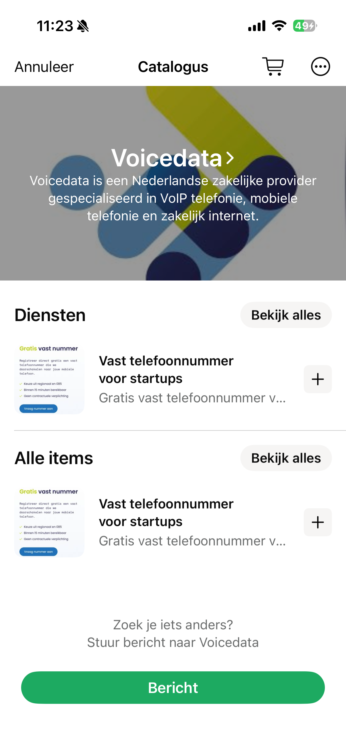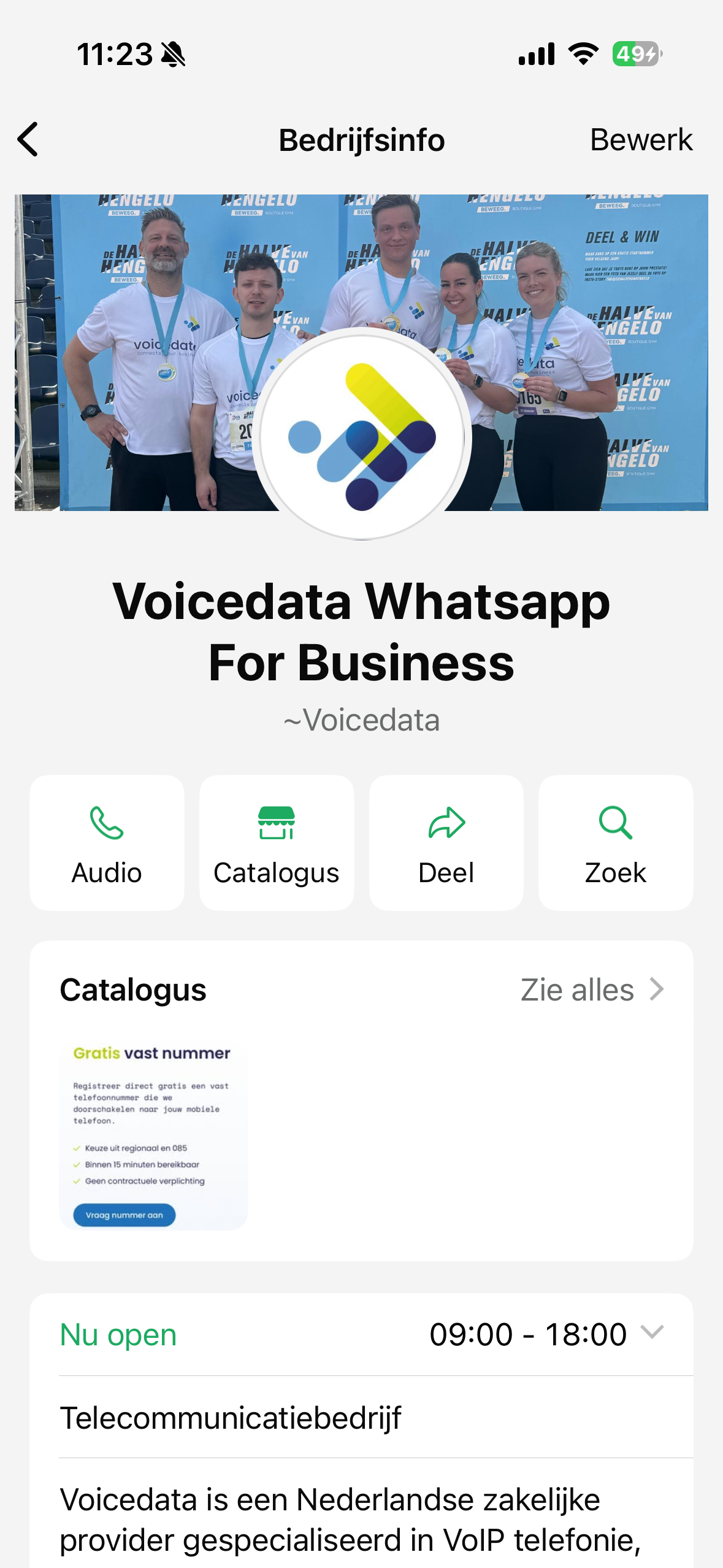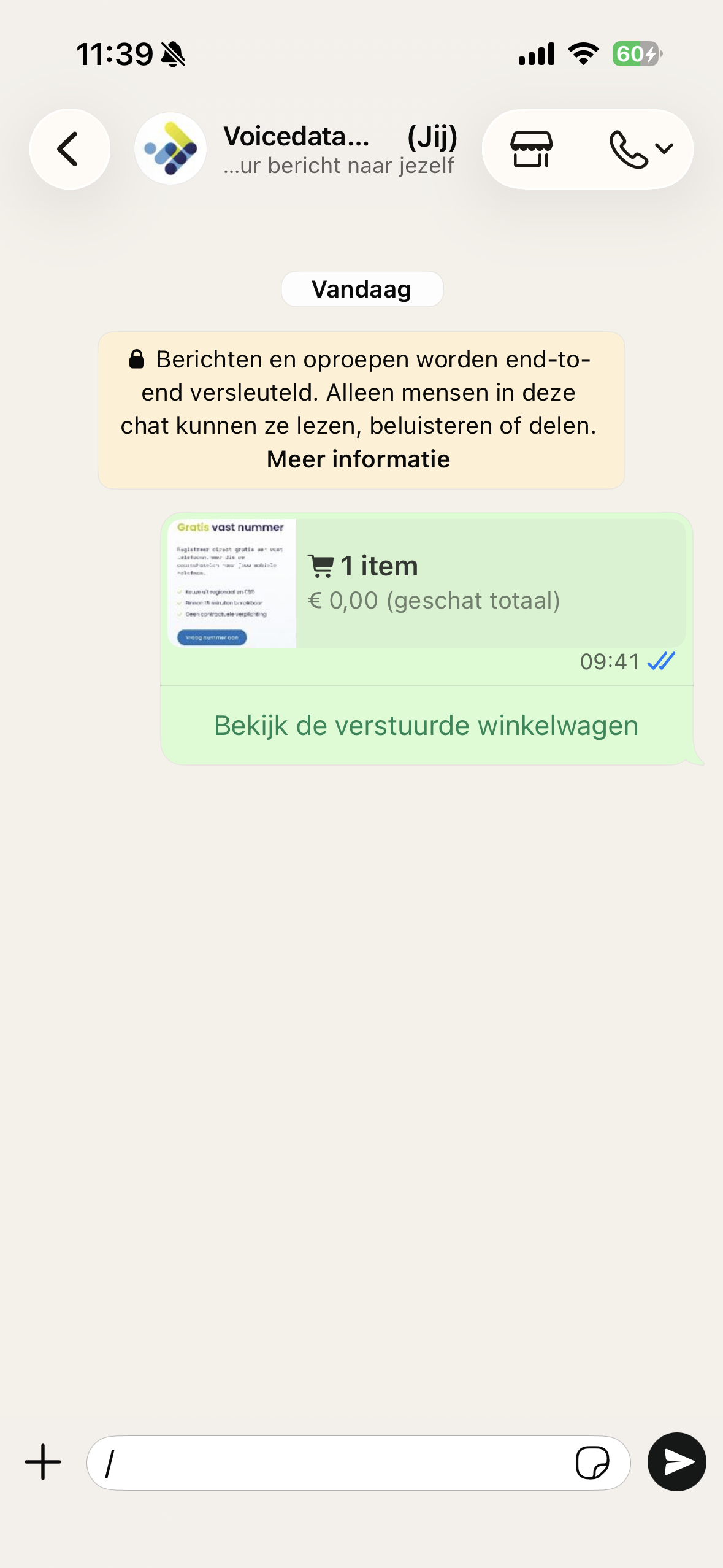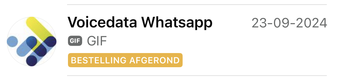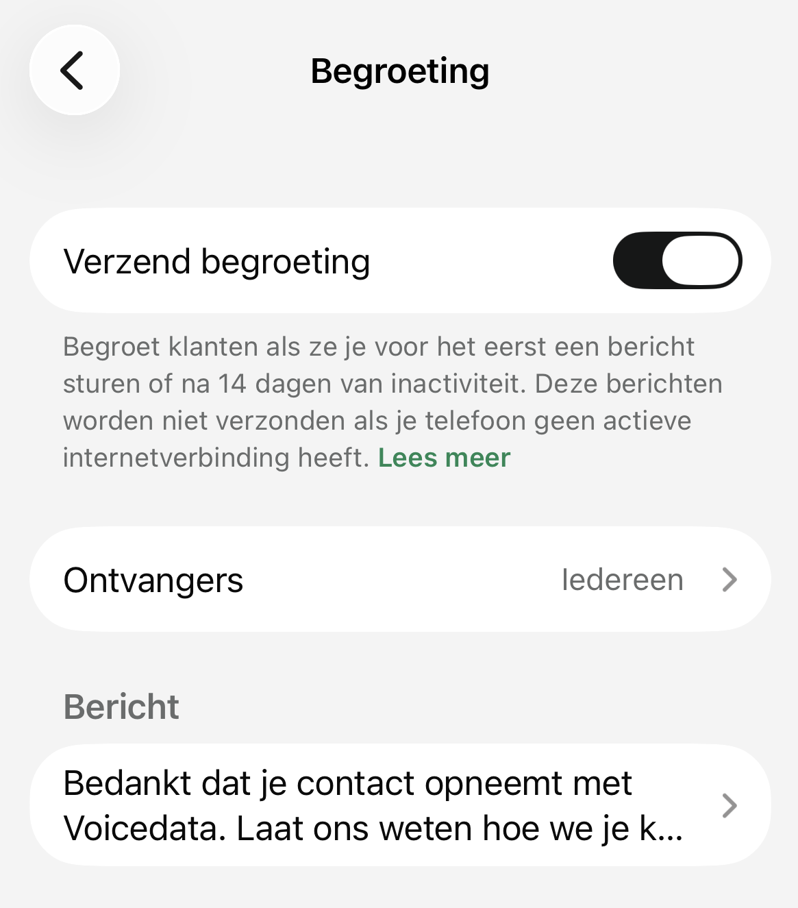 “Bedankt dat je contact opneemt met Voicedata. Wij reageren vaak binnen 2 uur op Whatsapp berichten op werkdagen tussen 9 en 5”.