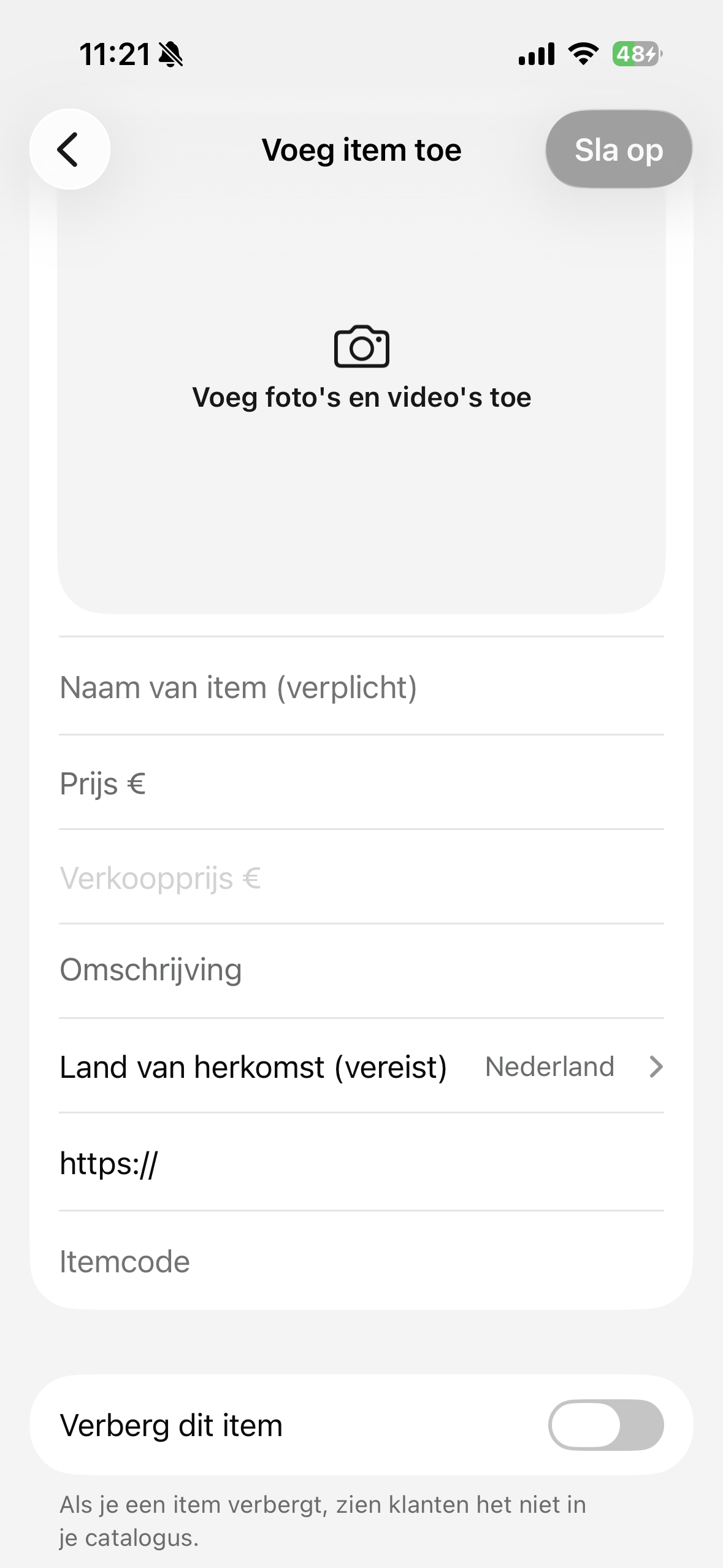 Een nieuw item toevoegen spreekt voor zich en opent een pagina waarin je een foto kunt toevoegen, een producttitel en productomschrijving, de prijs van het product en een link naar de webshop of bestelpagina. Zie het eerste screenshot onder deze tekst.