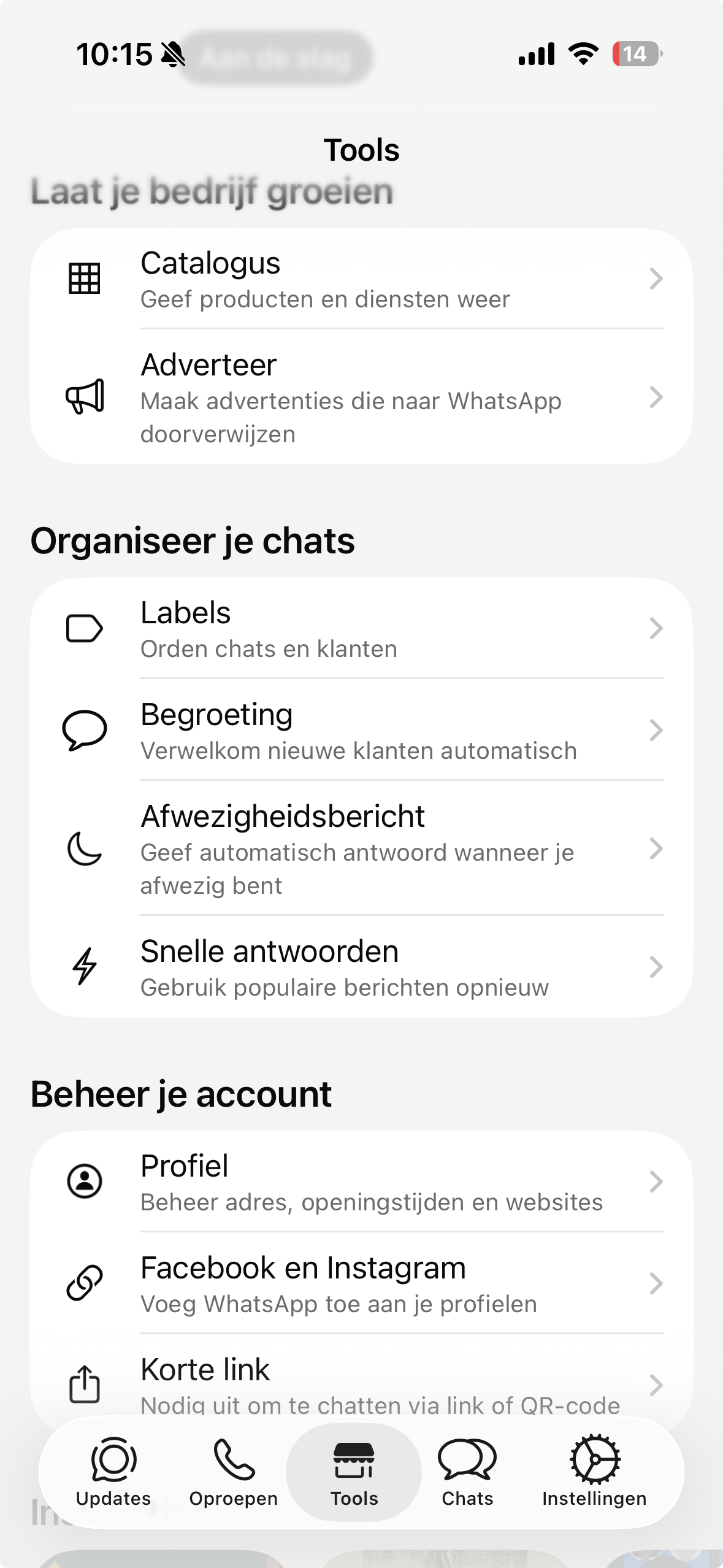 Het menu van Whatsapp Business bevat de optie Tools. Hier kun je verschillende zaken beheren binnen je Whatsapp for Business account, denk aan Catalogus, Advertenties, maar het belangrijkste zijn de tools om je chats te organiseren en er zijn wat handige links te gebruiken vanuit dit menu.