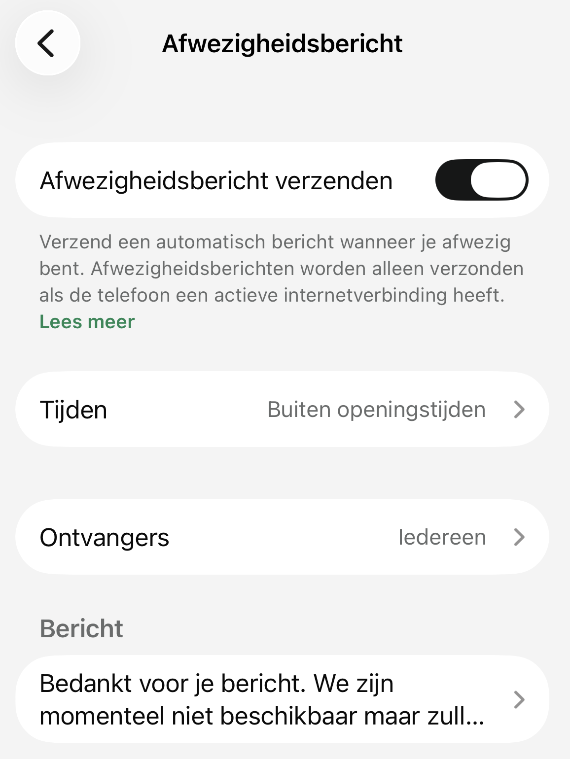 Bij het gebruik van openingstijden kun je een afwezigheidsbericht gebruiken om de verwachting van degene die contact met je opneemt te managen. Geef duidelijk aan wanneer je reageert op Whatsapp berichten en dat degene contact opneemt buiten openingstijden.